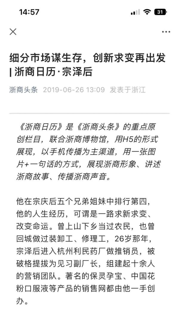 认证主体为“浙江省工商业联合会”的“浙商头条”2019年发布的一篇名为《浙商日历·宗泽后》的信息也显示,宗泽后在宗庆后五个兄弟姐妹中排行第四。