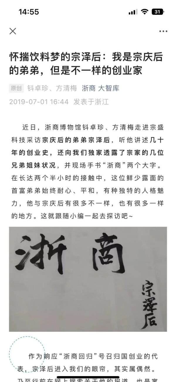 认证主体为“浙江工商大学”的“浙商 大智库”2019年发表的一篇《怀揣饮料梦的宗泽后:我是宗庆后的弟弟,但是不一样的创业家》文章显示:宗泽后是宗庆后的弟弟。