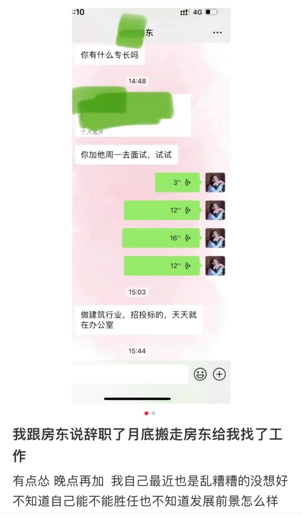 “房东知道我没工作了,就想着给我介绍一份好点的工作。”她说,房东大哥介绍了一份投标相关的工作,但她没有建筑行业的经验,还在考虑要不要去上班。