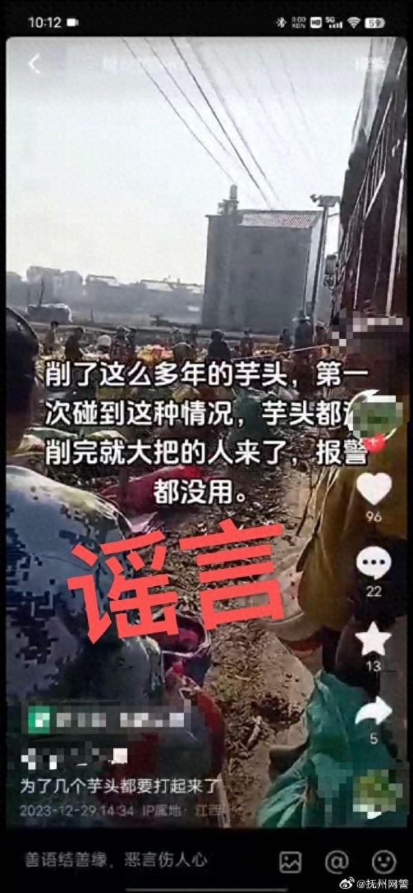 近日,临川网警工作发现,一网民在抖音发布视频称连城乡村民哄抢种植户芋头,“为了几个芋头都要打起来了,报警都没有用”。