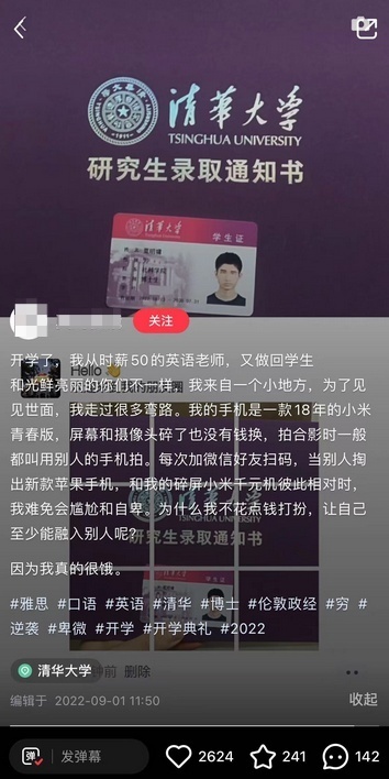 视频内容显示,一个穿着黄色外卖服装的男子自称送外卖赚学费,他边走边念英文,还晒出自己的清华学生证。