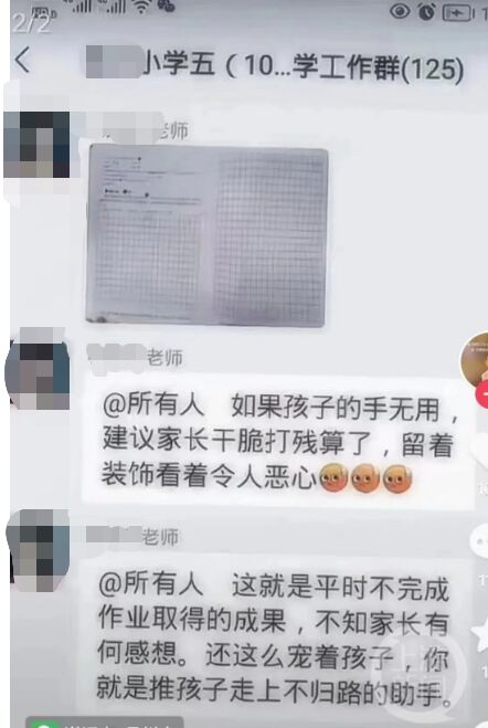 导读:近日,广东湛江吴川市一名小学老师在家长群建议家长“打残孩子手,留着令人恶心”的截图在网上流传。3月13日,当地教育局回应称,已介入调查此事。
