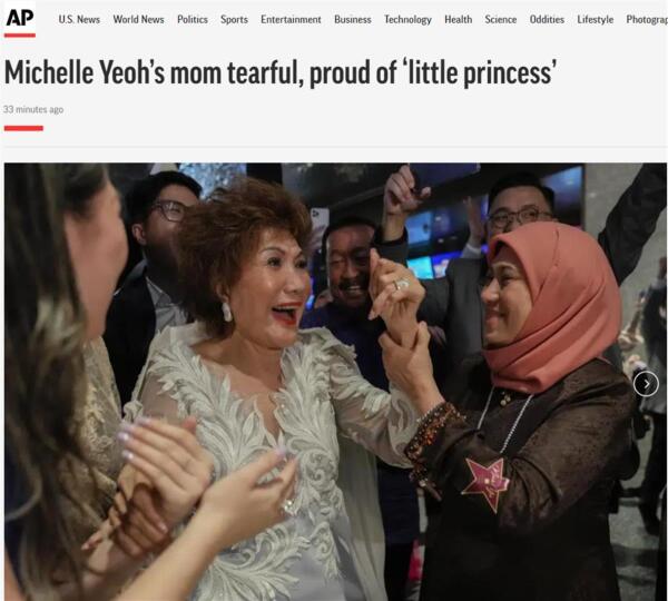据美联社3月13日报道,当地时间12日下午5时,第95届奥斯卡颁奖典礼在美国洛杉矶举行。最让中国影迷兴奋的是,61岁的杨紫琼战胜了被誉为“大魔王”的奥斯卡多届“影后”凯特·布兰切特,成为奥斯卡历史上首位华裔“影后”。杨紫琼84岁的母亲更是喜极而泣,她说,她为自己的“小公主”感到无比自豪。
