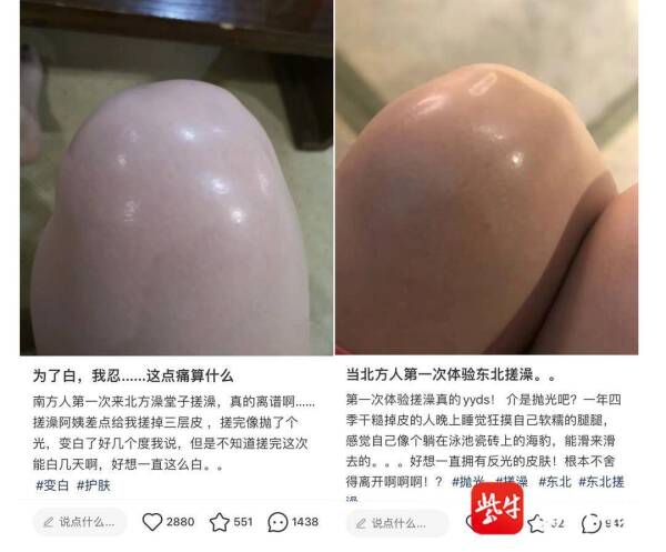 记者注意到,在社交平台#搓澡 #的相关话题超2 亿浏览量,有不少网友“跟风”体验,并晒出狠搓后“膝盖亮的能反光”的抛光图。第一次体验北方搓澡文化的网友这样感慨,“搓澡阿姨差点给我搓掉三层皮,搓完像抛了个光,变白了好几个度 。为了白,这点痛我可以忍受。”不过,在评论区也有被“搓伤” 的人提醒,“一方水土养一方人,我搓完澡,腿火辣辣的疼。”