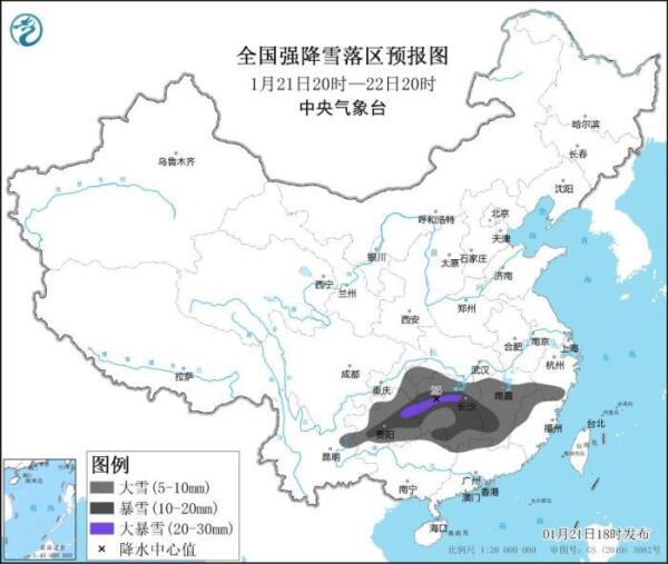 预计1月21日20时至1月22日20时,重庆东部、湖北西南部、贵州、湖南、江西、福建西部和北部、浙江南部、广西北部、广东北部等地的部分地区有大到暴雪,其中,贵州东部、湖南中西部等地局地有大暴雪(20~25毫米),上述部分地区新增积雪深度3~10厘米,局地可达15厘米以上。贵州东南部、湖南西南部、广西北部、广东北部等地局地有冻雨。