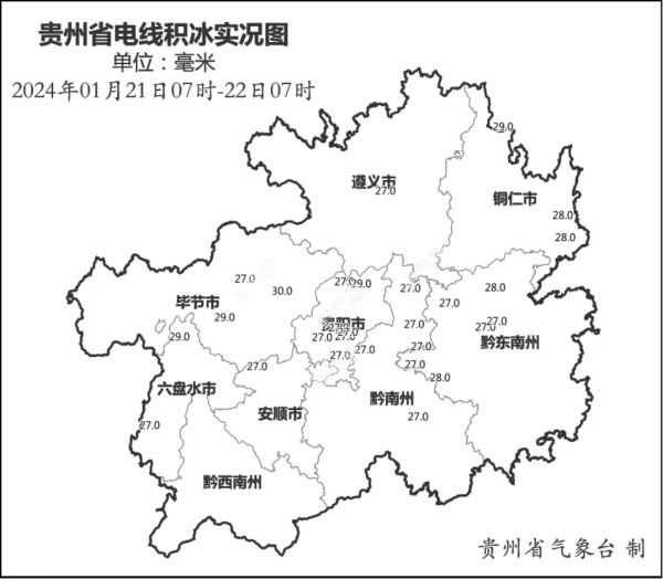 贵阳市城区21日07时至22日07时出现雨夹雪,电线积冰直径27毫米(含导线直径26.8毫米),07时气温为-2.7℃。