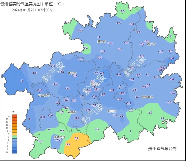 多彩贵州网讯(本网记者 王都安 通讯员 撒粒)据1月22日07时监测显示,目前贵州省内67个县(市、区)气温低于0℃及以下,最低为威宁-5℃。