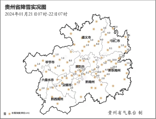 截止今日(22日)07时,除赤水、兴义、望谟、册亨、从江外,省内其余县(市、区)域内均出现降雪,黔东南州中北部、毕节市南部、六盘水市大部、铜仁市东部出现大雪到暴雪,其余市县出现小到中雪,其中52个县有积雪,台江、三穗、岑巩、天柱、万山、剑河、镇远、麻江8个区县积雪深度超过10厘米,最大为台江13厘米。省的中部一线28个区县出现电线积冰,积冰最大直径为黔西30毫米(含导线直径26.8毫米)。