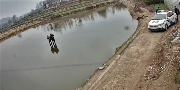 警方到达池塘时,发现这两人站在水面中央一动不动,画面神似“轻功水上漂”。