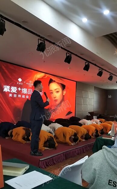 网传视频显示,员工分别穿着黄色、白色和黑色工作服,跪在台上,跟着主持人喊“感谢父母,养育之恩”,主持人又喊“拜”,员工集体磕头。