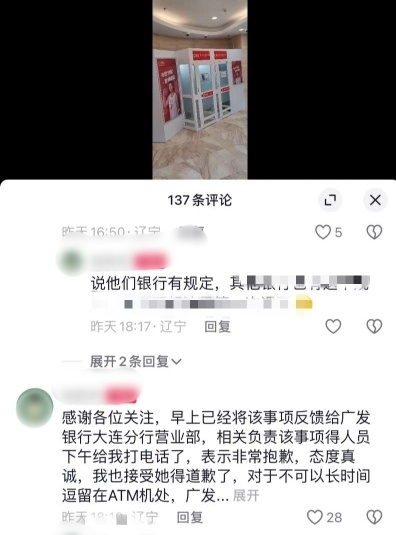 据爆料人介绍,当时,室外非常寒冷,这名女子在ATM间等车时,被银行的摄像头喊话提醒,并告知再不走就将召唤保安处理。随后,该女子在评论区回应称,广发银行已对此事进行了道歉。
