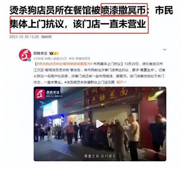 当时,这件事闹得沸沸扬扬,不仅线上的网友们很愤怒,在线下,涉事门店也被一些市民喷漆、撒冥币、摆花圈,墙上还用红漆写着“杀狗”等字样。