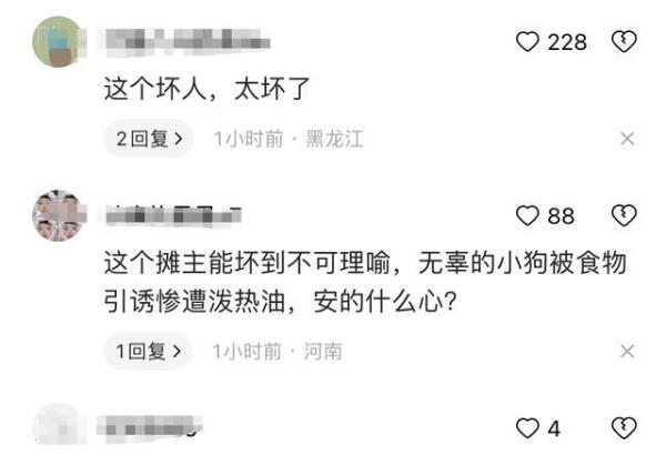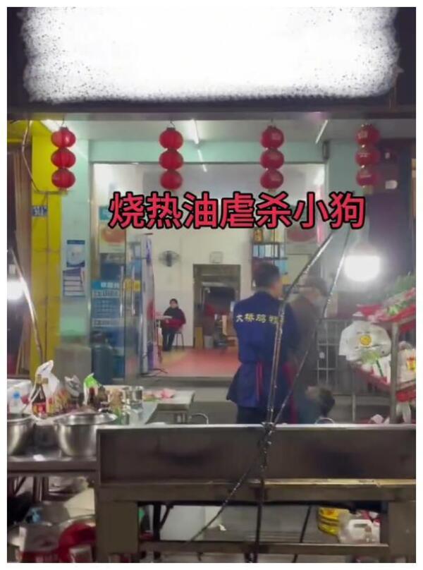 本以为是投喂食物,没想到店员等到小狗靠近,确认位置后,迅速将滚烫的热油泼出去。小狗躲闪不及,被油泼到后哀叫连连,十分凄惨。