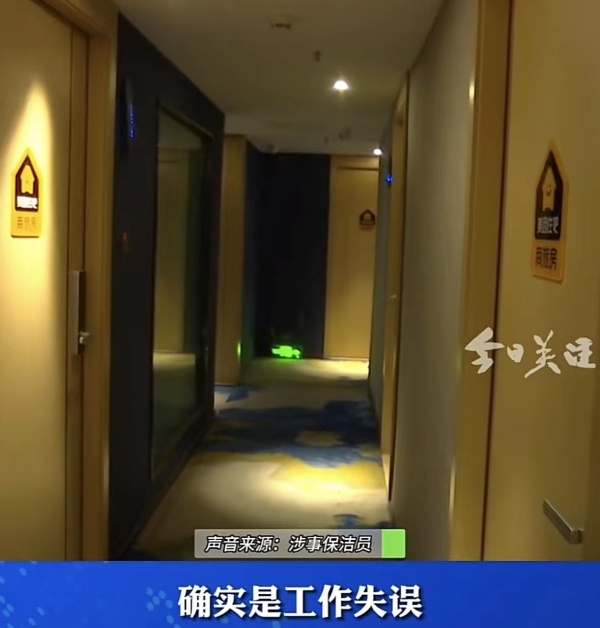涉事保洁员称,“(客人)延迟退房到6点,(下午)5点4、50分左右,我就以为是退了(然后开门),我就跟客人说对不起,我都不敢在门口停留,确实是工作失误,我也没看到他什么。”