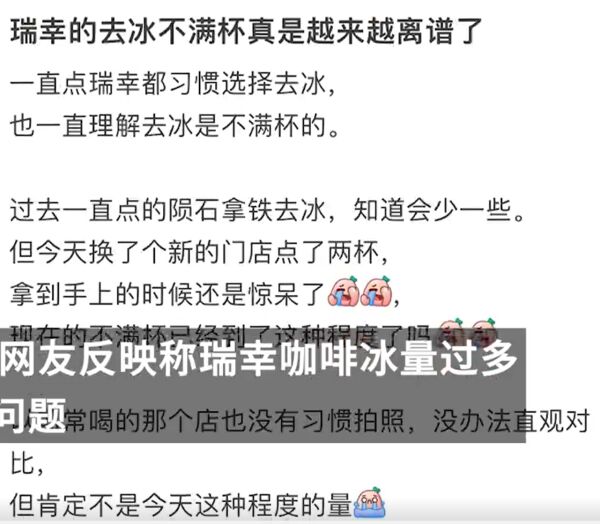 3月14日,据九派新闻视频报道,近日,有多名网友在社交平台上发文称,瑞幸咖啡的冰量过多,去冰后咖啡量少,引起广泛关注。