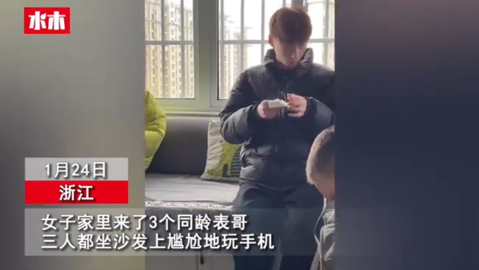 导读:1月24日,浙江。女子家里来了3个同龄表哥,三人都坐沙发上尴尬地玩手机,视频中的3个表哥坐沙发上互相隔了两米远,人人都在低着头玩手机。