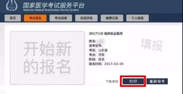 此时页面跳转到考试报名界面,点击打印按钮,打印《医师资格考试网上报名成功通知单》。
