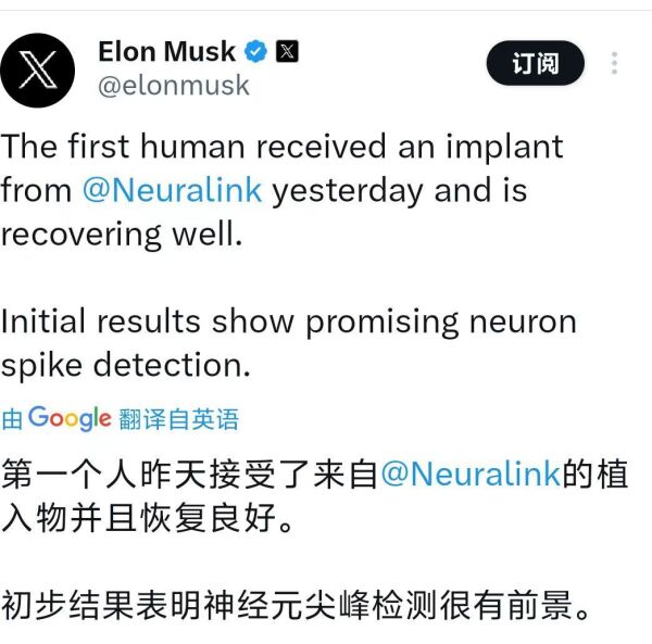 北京时间1月30日,马斯克在社交平台X宣布,昨天首例人类接受了脑机接口公司Neuralink的植入物,目前恢复良好。初步结果显示神经元尖峰检测(neuron spike detection)表现出良好的前景。