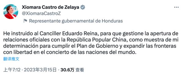 导读:据外媒报道,洪都拉斯总统希奥玛拉·卡斯特罗3月14日发推文称,她已指示洪都拉斯外交部长爱德华多·雷纳寻求与中华人民共和国建立正式外交关系。