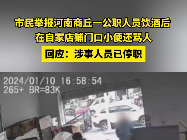 一段监控视频显示,1月10日16时57分,两名男子站在一家店铺门口,其中一名黑衣男子拿出手机开始打电话,约1分钟后,黑衣男子解开裤子做出小便动作。随后,从店铺内走出一名男子,将黑衣男子拉入店内,不久后另一名男子也从店里走出,双方发生言语冲突后出现推搡动作。发布视频的网友称,在其店铺门口随意小便的男子是商丘市农业农村局公职人员刘某,当天刘某曾喝酒,并辱骂店内人员。纵览新闻记者尝试联系该网友,截至发稿前未收到回复。