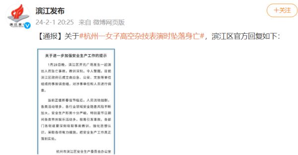 2月1日晚,@滨江发布官方对此进行了通报。通报称,1月28日晚,滨江区开元广场发生一起演出人员坠亡事故,教训深刻,令人警醒。目前滨江区政府已成立由应急、公安、文旅等单位组成的事故调查组,对涉事单位和人员进行调查。