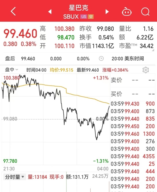 截至美东时间3月14日收盘,星巴克(SBUX)报99.46美元,涨幅0.38%,市值1143.1亿美元。