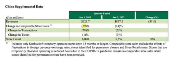 疫情期间,星巴克中国同店销售额下降29%,同店交易量下降28%,平均客单价下降1%。财报显示,截至2023年1月1日三个月内,星巴克中国市场营收6.217亿美元,同比下跌31%。
