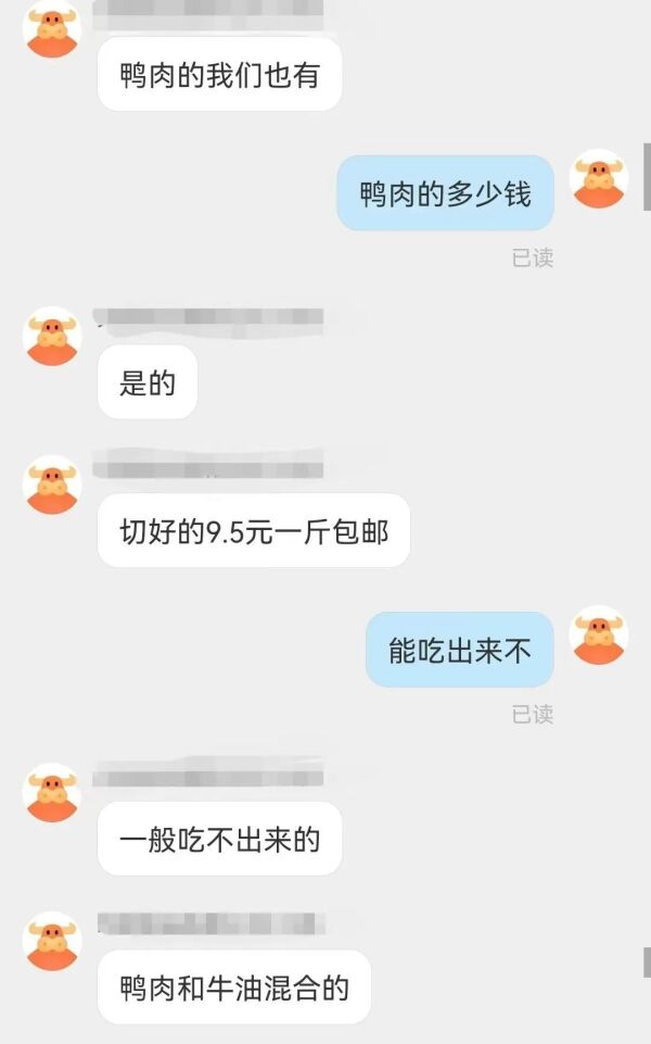 ▲电商一商家销售混合牛油的鸭肉卷,并称用作红油火锅“一般吃不出来”。 对话截图