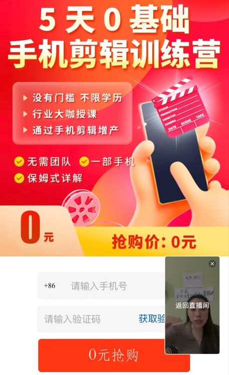 3月10日,贝壳财经记者在短视频平台搜索发现,多个账号正在直播宣传“0米剪辑训练营”。“0元0基础”“5天学手机剪辑”等标语醒目地贴在直播间背景板上,主播反复讲解如何进群学习。