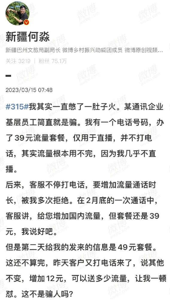 这位微博名叫“新疆何淼”副局长在网上发文称:自己因为此前办理套餐的事情憋了一肚子火。他表示,自己有一个办了39元流量套餐的电话号码,仅用于直播,并不打电话,但是因为基本不怎么直播,流量其实根本用不完。但是后来客服不停打电话,提示其升级更高流量和通话时长的套餐,但是被他多次拒绝。但是之后客服跟他说,可以给他增加国内流量,套餐的价格依旧是39元不变,听到客服这么说,他于是最终还是同意了。