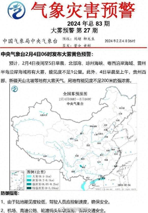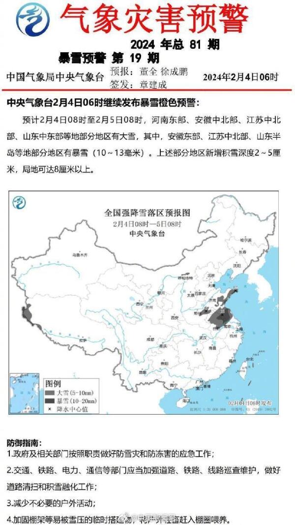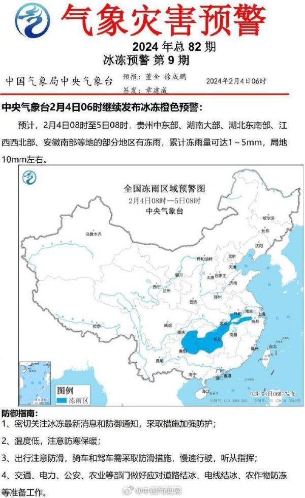 导读:脉络· 事情详述 中央气象台2月4日06时发布大风蓝色预警、大雾黄色预警,继续发布暴雪橙色预警、冰冻橙色预警。 预计今天8时至明天8时,贵州、湖南、湖北、江西、安徽等地部分地区有冻雨,安徽、江苏、山东等地部分地区有暴雪。北方降雪在后天基本结束,南方大范围雨雪则持续到除夕前。关注天气变化,出行注意安全! 来源:@中国新闻网 v_1, rw_3, rh_4, maxl_700, pad_1, 中央气象台四, 中央气象台, 四预警齐发