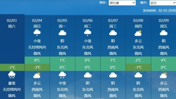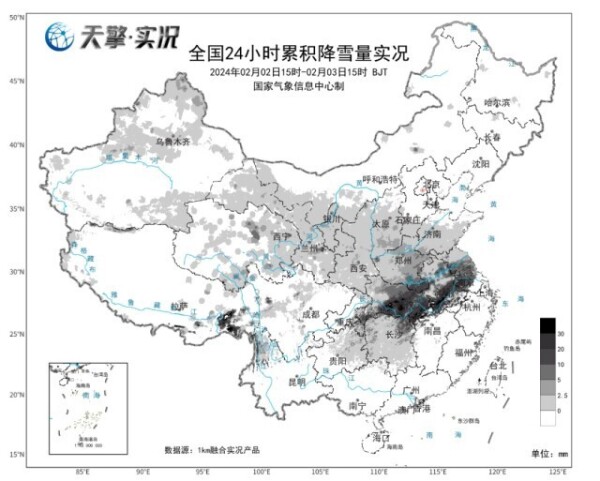 今天晚上到明天中午,湖北、安徽等地还有强降雪。预计2月3日20时至4日20时,河南南部、湖北大部、安徽中北部、江苏西部、湖南北部、重庆东部、贵州东北部等地的部分地区有大到暴雪,其中,湖北东北部、安徽中部等地的部分地区有大暴雪(20~24毫米)。上述地区新增积雪深度3~10厘米,局地可达20厘米左右。