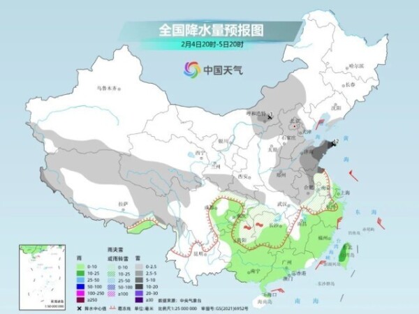 5日以后,北方地区降雪会大幅收缩、6日基本结束,但由于南方暖湿气流较为活跃,南方地区大范围雨雪天气将持续到除夕之前。