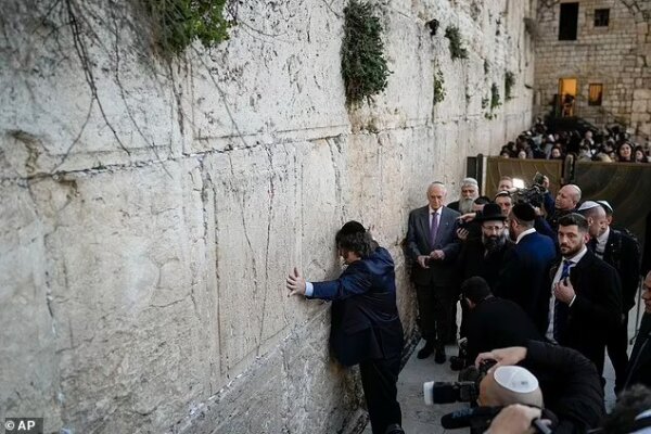 头顶“基帕”的米莱,下飞机后没有前往特拉维夫,而是直奔耶路撒冷,站在被犹太人视为最神圣的地方之一的哭墙前,展现出了很是虔诚的一面,很容易让不知情的人觉得他是犹太裔。米莱曾表示他考虑皈依犹太教,但又觉得那会和自己的总统工作相冲突。