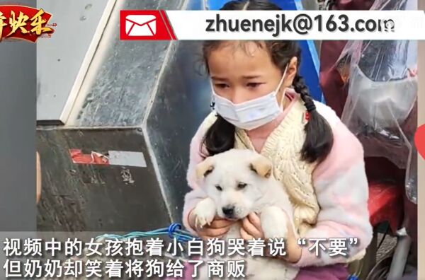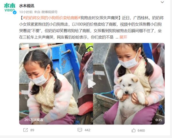 据@水木视讯报道,近日广西桂林,一位奶奶要卖掉孙女儿的狗狗卖掉,女孩儿紧紧抱着狗狗说不要卖,不要卖!可是奶奶还是笑着把狗狗以100元的价格卖给了狗贩子。女孩儿顿时忍不住失声痛哭,但是却无可奈何,一边哭,一边回头看看被狗贩子拿走的狗狗。