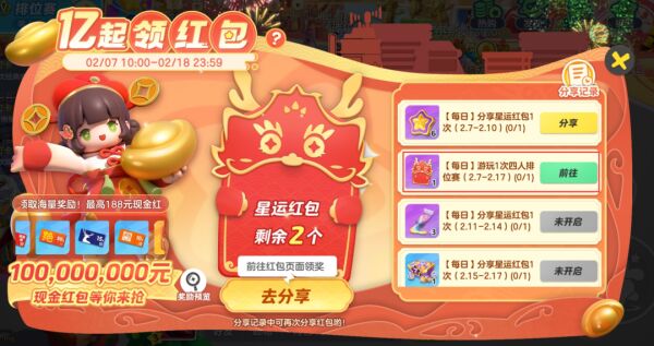 据官方公告所示,在2月10日,也就是大年初一这天,玩家拆星运红包将必得现金奖励。只需登录游戏,并点击参与“亿元红包”活动,大家便可领取并开启最多五个星运红包,单个红包现金保底0.66元,最高可开出188元的大奖。也就是说当日保底也可获得3.3元现金红包,最欧的情况下可获得近千元红包奖励!不过需要注意的是,打开星搭子分享的星运红包需要在当天进去游戏内才可领取,各位小伙伴可别忘了。