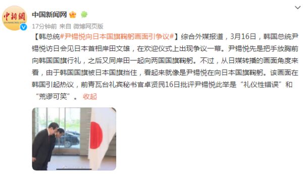 导读:3月16日,韩国总统尹锡悦访日会见日本首相岸田文雄,因日媒转播的画面角度原因,尹锡悦向日本国旗鞠躬画面引争议。