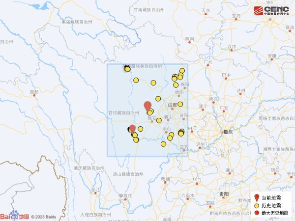 根据中国地震台网速报目录,震中周边200公里内近5年来发生3级以上地震共172次,最大地震是2022年9月5日在四川甘孜州泸定县发生的6.8级地震(距离本次震中126公里),按震级大小前50次历史地震分布如图。