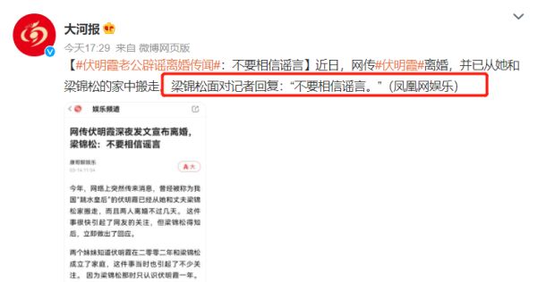 这件事情也持续发酵,伏明霞的老公梁锦松也正式回应,他希望外界不要相信谣言。如此,梁锦松就否认了夫妻二人离婚的消息,从目前来看,真相就是网上所流传的消息不实,但其中是否有其他内幕,外界也不得而知,很多网友也纷纷表示,无风不起浪,现在重磅新闻并非空穴来风。