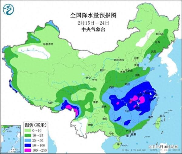 未来10天(2月15-24日),黄淮、江汉、江淮、江南、华南及贵州东部、重庆、四川盆地东部、西藏东南部等地累计降水量有10~30毫米,部分地区有40~70毫米,其中江南北部、江汉东部、苏皖南部等地局地有80~120毫米;西北地区大部、华北大部、东北地区累计降水量有2~7毫米,新疆北部和西部、陕西、山西南部、河北南部、吉林、辽宁等地有10~20毫米,局地30毫米以上;上述大部地区降水量较常年同期偏多5成至1倍。