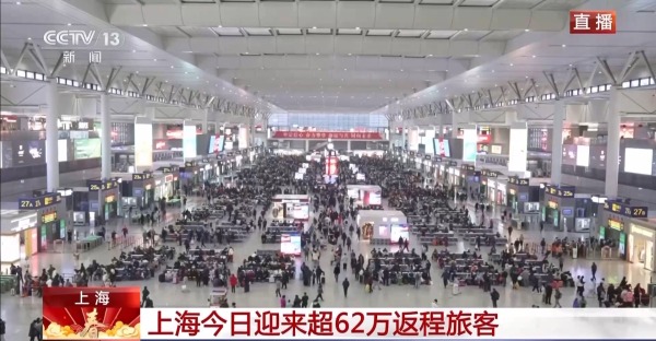 今天,上海各大火车站将总共迎来62.2万人次的返程客流,其中上海海虹桥站为37.5万人次,是返程客流最大的火车站。