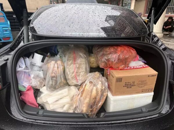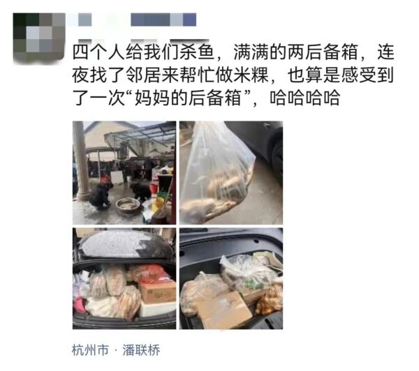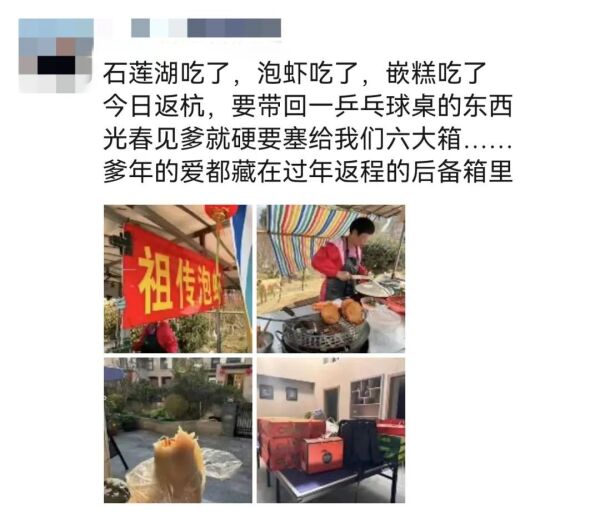 很多人还把年味带回了家中,鸡蛋论筐、蔬菜论捆、水果论箱,回趟老家跟进货似的,还有装了满满一车蔬菜的,仿佛被父母“塞了个菜市场”。
