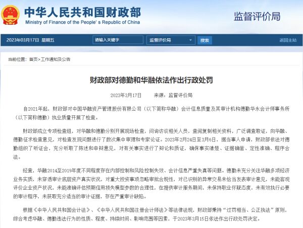 导读:3月17日,据财政部网站,财政部对德勤和华融依法作出行政处罚,德勤未充分关注华融多项经济业务实质,未穿透审计底层资产真实状况,存在严重审计缺陷。