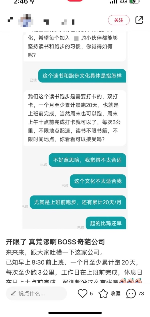 “公司上班时间是8点半,本来上班时间就早,还要跑步,我就跟HR调侃了一句‘这起得比鸡早’。而且休息日也要在上午10点前完成晨跑,意味着不能睡懒觉,我觉得这个规定很奇葩,便拒绝了面试,不能理解这种文化。”