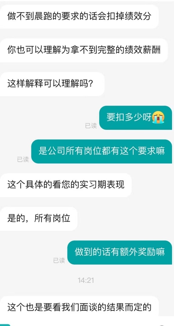 3月17日,九派新闻记者以应聘者身份联系涉事公司。一名人力资源同样表示,“公司主打上进文化,所有岗位员工一个月需要晨跑至少20天,读书是备选活动。如果达不到晨跑要求会扣除绩效分,拿不到完整的绩效薪酬。”