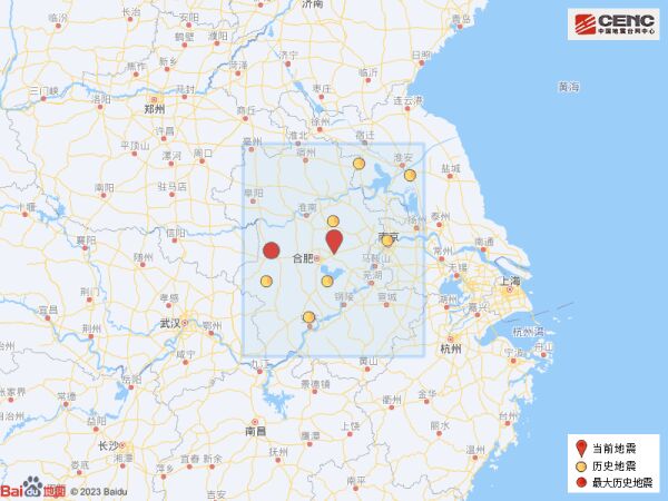 震中距肥东县17公里、距瑶海区31公里、距庐阳区34公里、距包河区35公里、距蜀山区36公里,距合肥市38公里。