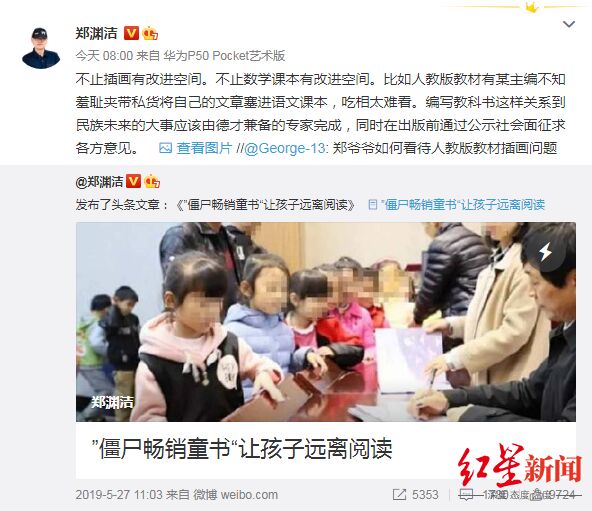 知名童话作家郑渊洁也关注到了网友讨论。其向红星新闻表示,“人教版的教材我一直是有看法的,不止是插图的问题,也不止数学的教材。”据了解,郑渊洁的孙女正在读小学,因此他也经常翻看孙女的书本。郑渊洁发现,“其中有一个主编,在主编人教版语文课本的时候,把自己的作品放进去,他本身也是个作家。我觉得这就没有底线了,相当于既当裁判又当运动员。”