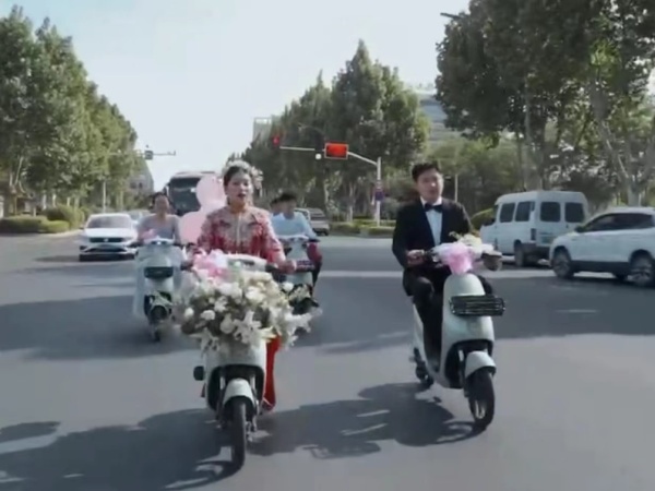 视频画面显示,新郎新娘、伴郎伴娘和摄影师全都骑着共享电动车,共享电动车上装饰有捧花和丝带,车后绑着气球。所有人脸上都洋溢着幸福的笑容。