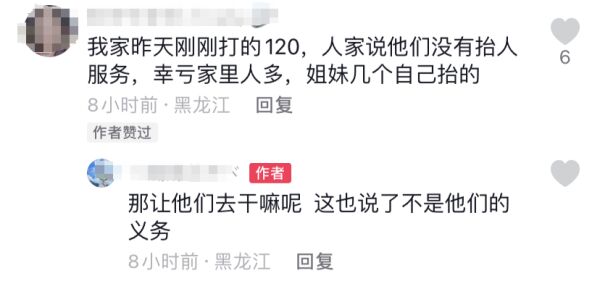 因为之前也打过120出诊,从来没遇到过这个问题,一时间女子还没反应过来:啥问题啊?上次来都抬了啊,你们哪个医院的啊?
