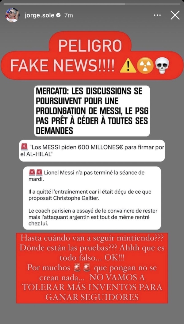 梅西父亲写道:“危险,假新闻!!!!他们什么时候才能停止造谣???证据在哪里???这全都是谣言……好吧!!!不论他们说了多少,没有一句值得相信……我们不会再忍受这些博取关注的谣言。”